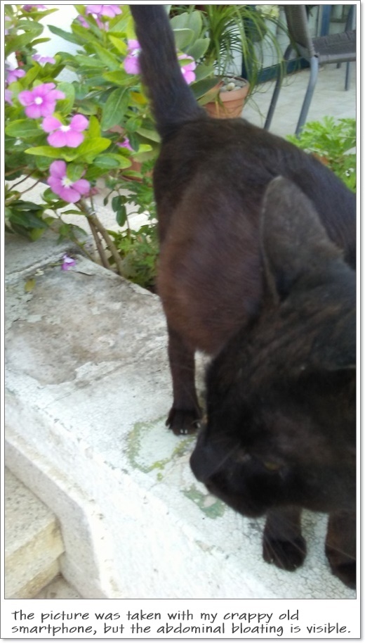 A couple of days after, and with his belly even bigger, I managed to lure him into a cage and took him to the vet. My veterinarian, a very experienced and animal loving professional, immediately sedated him, and started draining fluid from his abdomen! Fluid in the abdomen is always a bad sign. There are 4- 5 different major causes of abdominal fluid buildup, and most of them are fatal! An accurate diagnosis requires, besides the physical examination, a lot of laboratory tests, and in the case of FIP (Feline Infectious Peritonitis) results can still be inconclusive. After some tests, that we could perform on a limited budget, we were left with 2 possibilities. Wet FIP or right-sided heart failure, both fatal and untreatable. Cats with wet FIP usually die within a few days or perhaps weeks, whereas cats with heart failure, with the proper medication, can last longer. We decided, as long as he did not seem to suffer greatly, and his appetite was still healthy, to place him in my backyard where I could feed and water him properly, plus give him some medication with his food, to ease his bloating condition. The plan worked fine for six days, and Panthera's bloating seemed significantly smaller. His appetite was great, as always, and he seemed to be able to move with more ease. I started hoping for a miracle, even though the doctor was not sharing my optimism. Alas, on the 7th day he just disappeared! At the time of writing this, it's been 4 days and he hasn't yet returned. I am afraid we will not see him again. You can read more about Feline Infectious Peritonitis here... |
